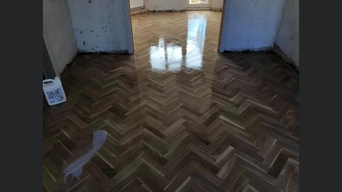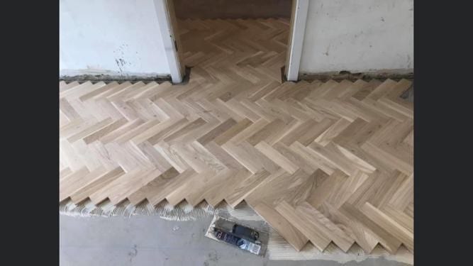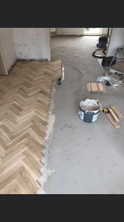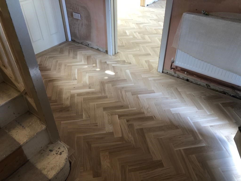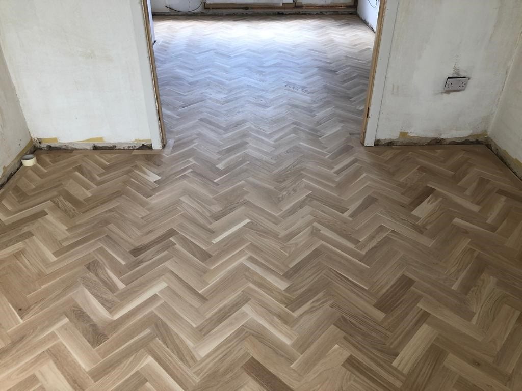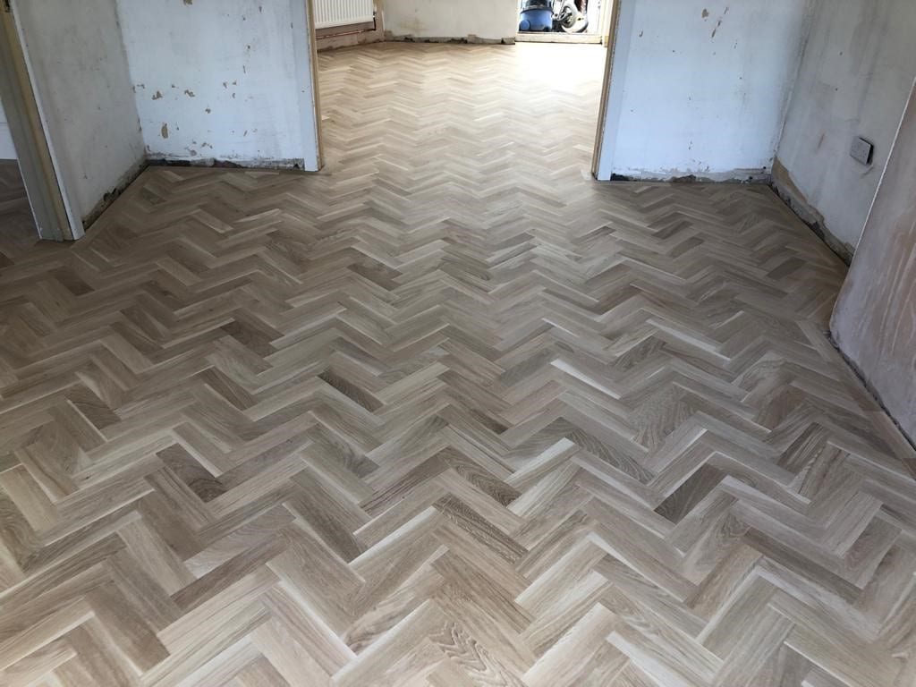 Here we fitted a 20mm Rustic Grade Oak 20/6x70x280mm Engineered Wood Block in the Herringbone Design with a 1 block border to the perimeter.