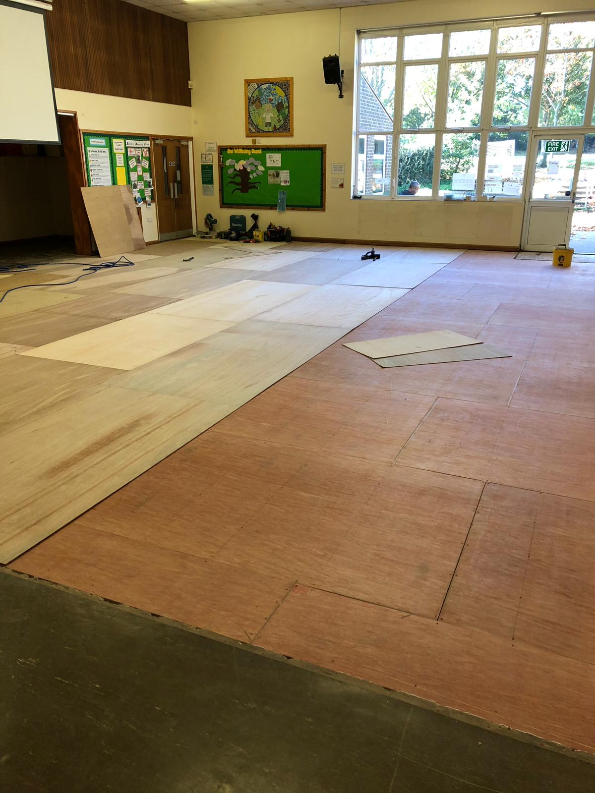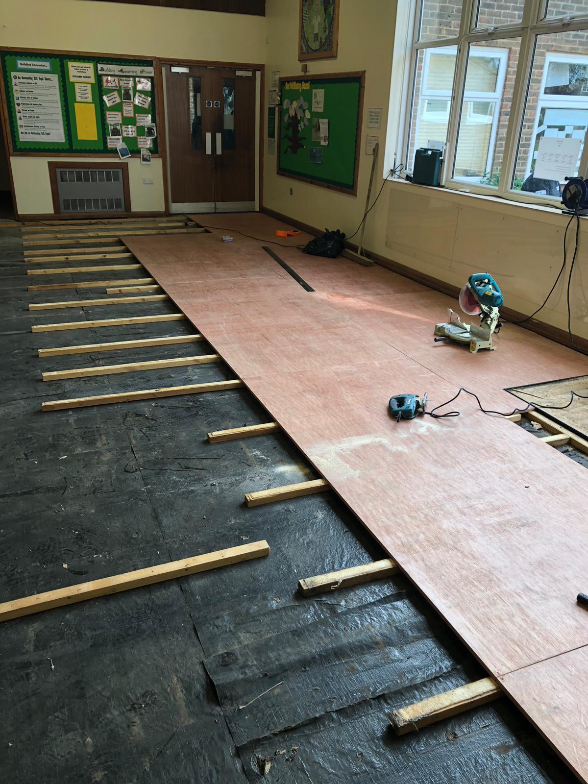 Before we began, we arranged for the climbing frames to be professionally lifted and safely secured. We then removed existing Junkers timber flooring from the existing battens. Then we built up the sub-floor with latex, chippings and battens to bring the levels back up to their existing figures.