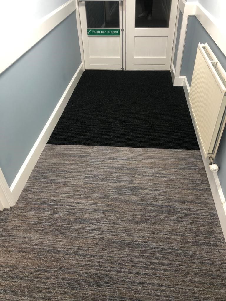 Fitted new carpets tiles to corridor, viewing lobby, side entrance and stairs, all stairs were then fitted with new black PVC nosing’s and finally new matting was fitted to the entrance.